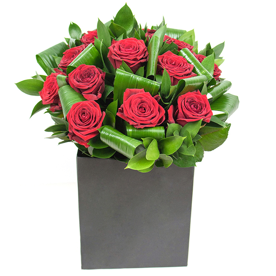 Transform your home with our Luxurious Red Rose Collection. This exquisite bouquet features radiant red roses complemented by lush aspidistra leaves and charming ruscus, offering a unique and captivating floral arrangement.