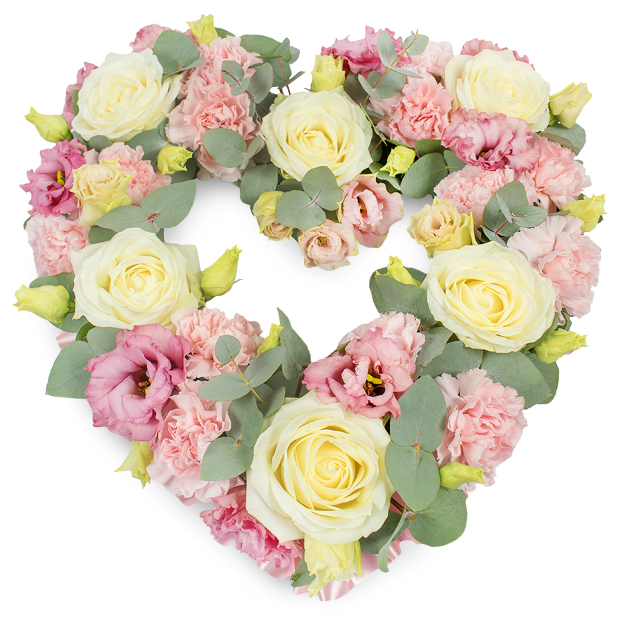 Express your heartfelt condolences with our sophisticated open heart tribute bouquet. This beautiful arrangement combines white roses, soft pink carnations, graceful pink lisianthus, and fragrant eucalyptus leaves, expertly arranged to symbolize love and remembrance.